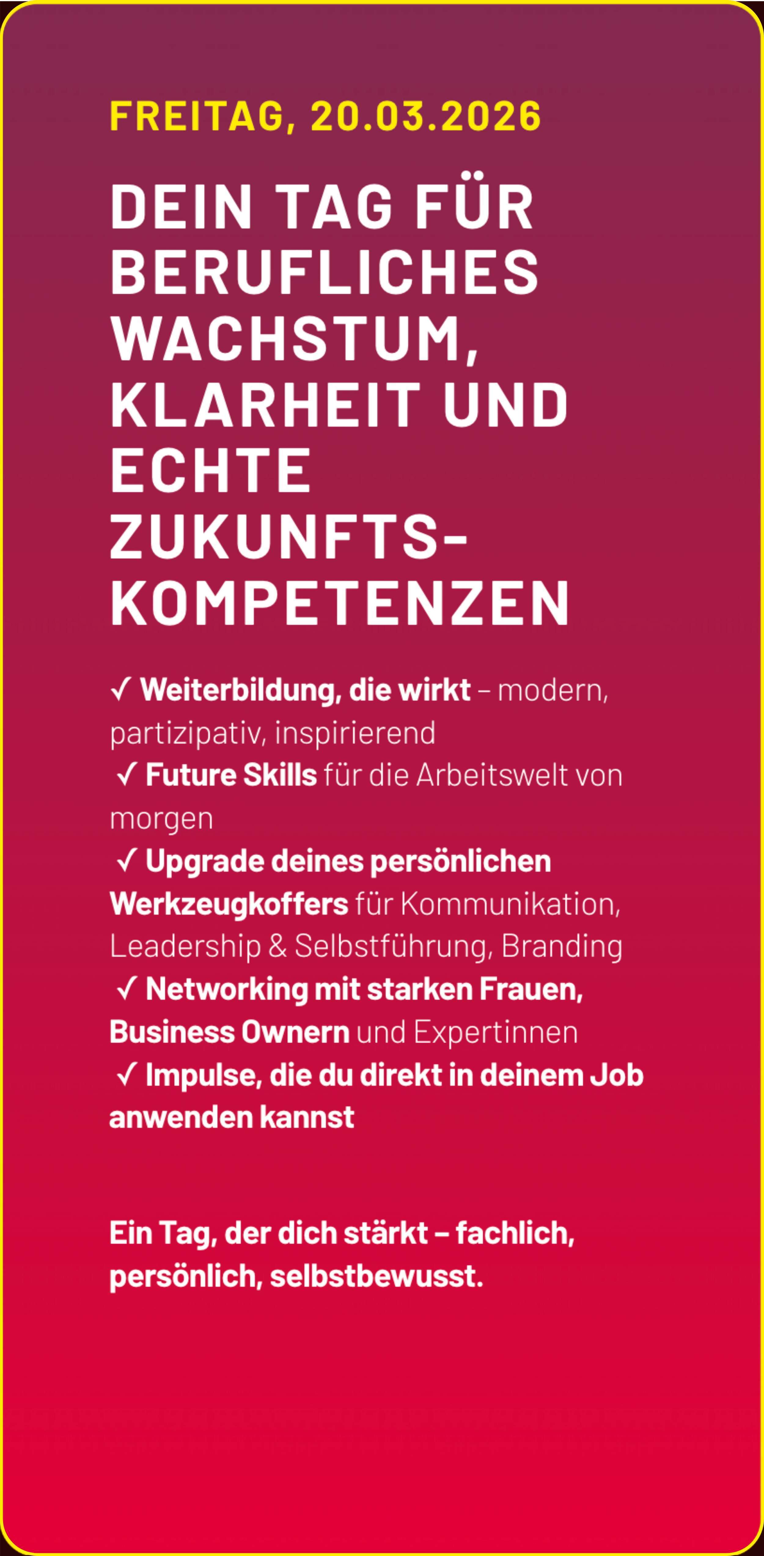 • Alle, die sich für Female Empowerment, berufliche und persönliche Weiterentwicklung, Austausch und neue Perspektiven interessieren – unabhängig von Geschlecht, Alter oder Branche.