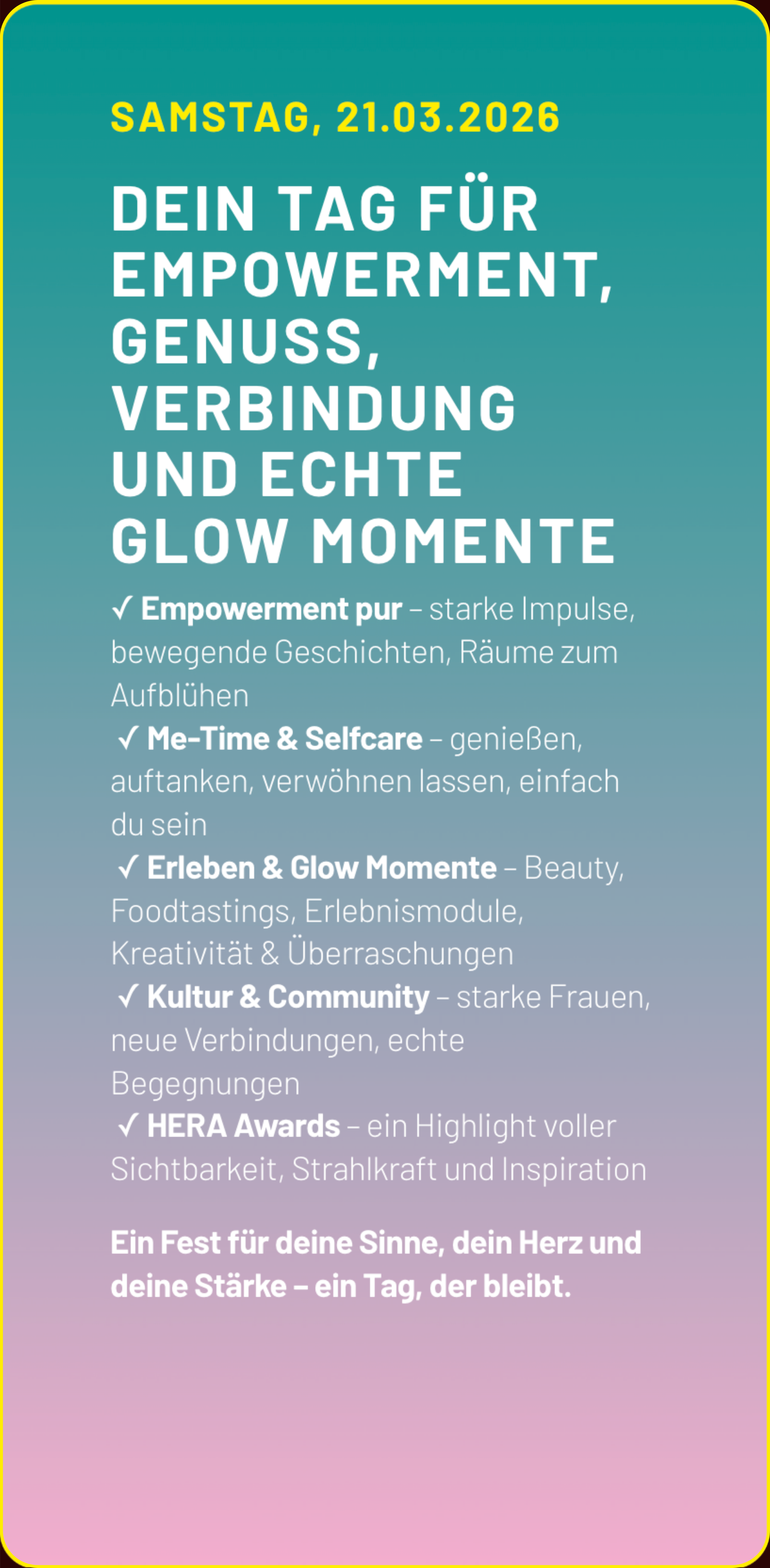 Wir bringen aktuelle Trends ebenso wie Tabuthemen auf die Bühne, schaffen echte Räume für Vernetzung und gehen diesen Weg mutig gemeinsam.